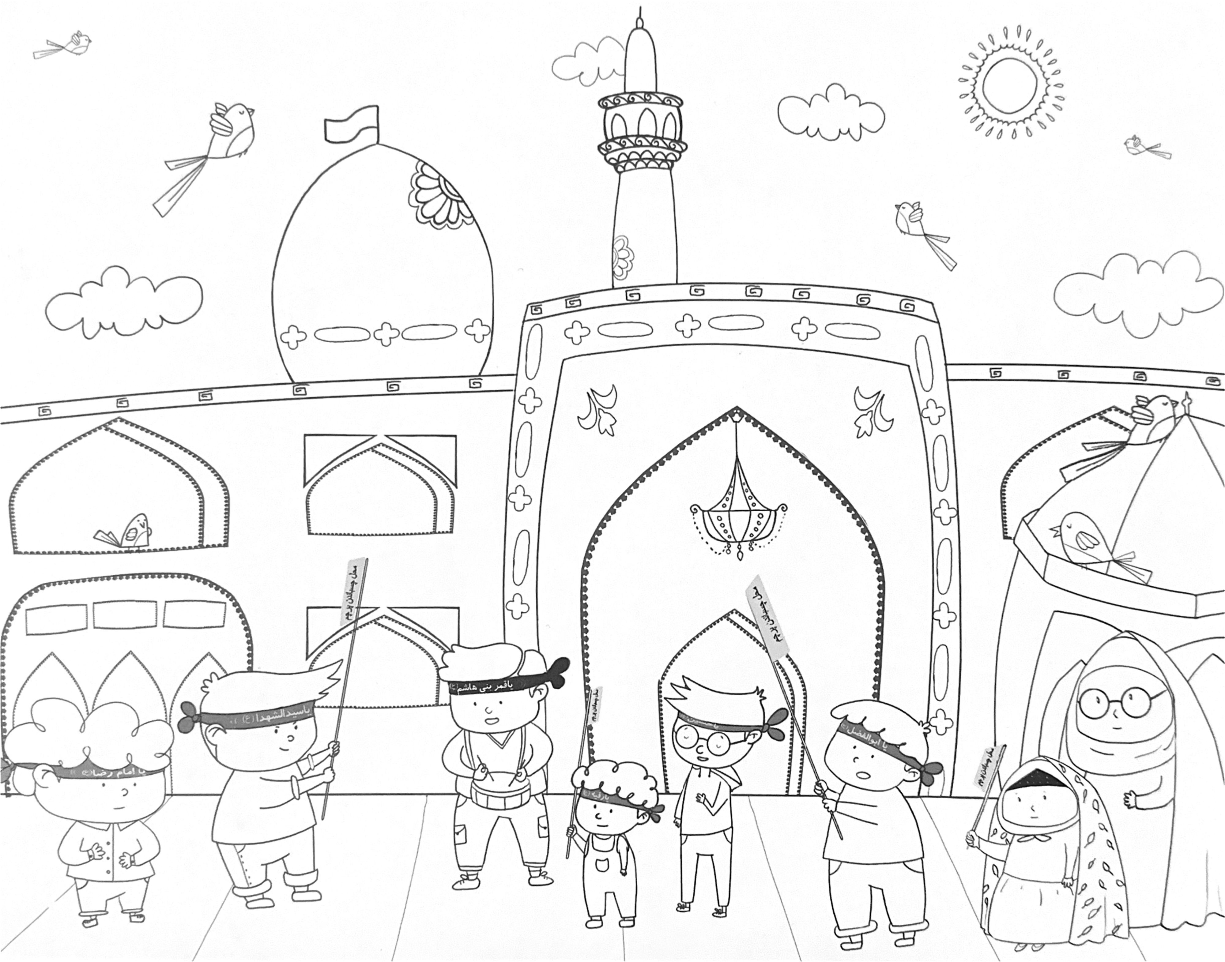 رنگ آمیزی با موضوع دسته عزاداری کودکان در حرم