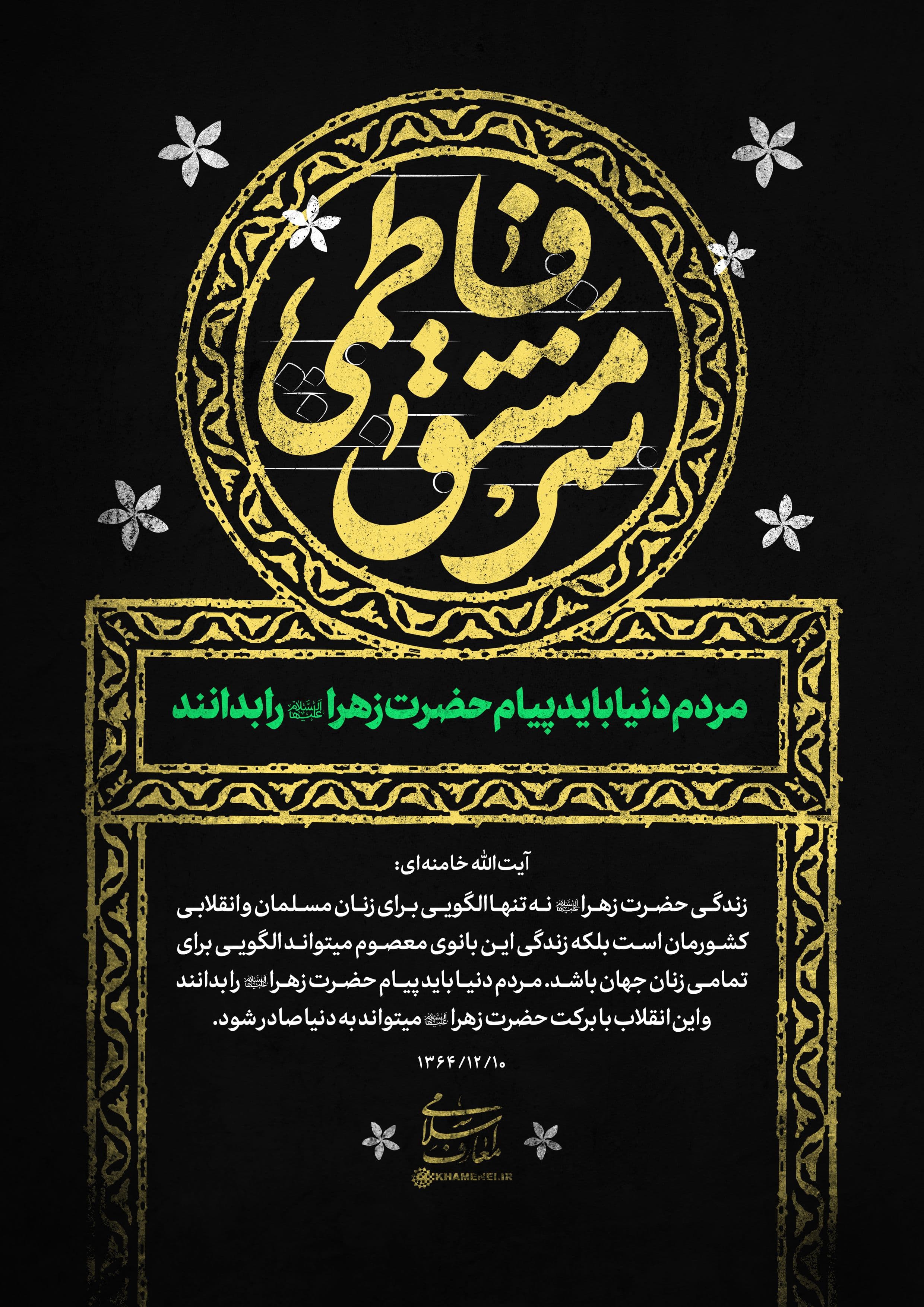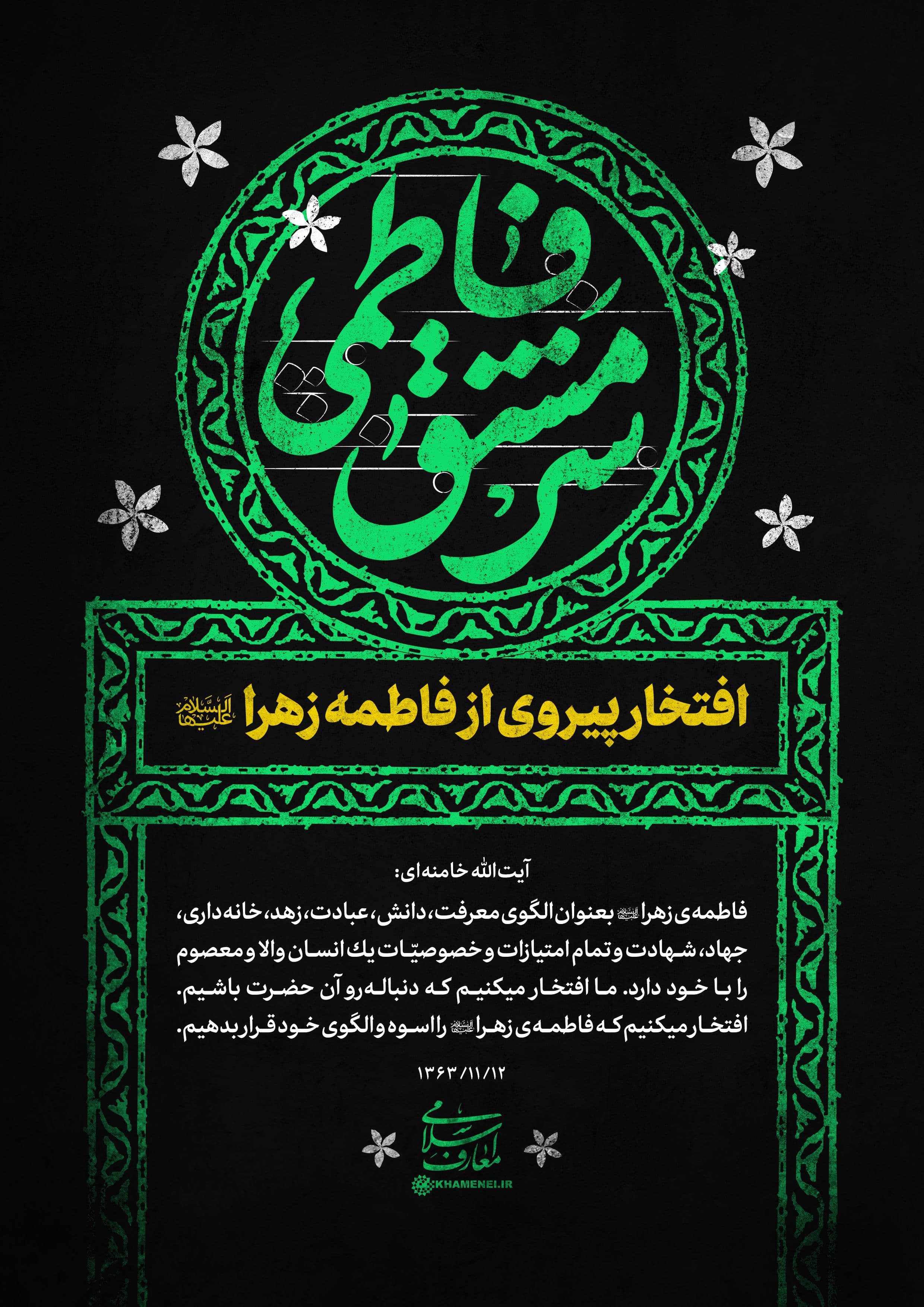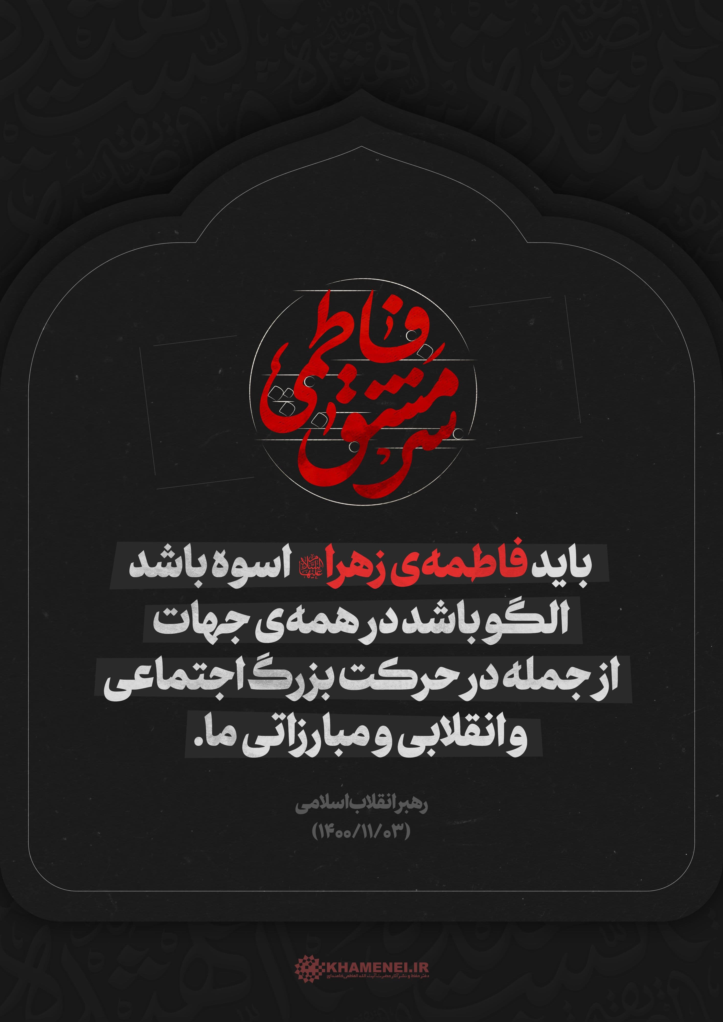 رهبر انقلاب: باید فاطمهی زهرا (سلام الله علیها) اسوه باشد، الگو باشد در همهی جهات، از جمله در حرکت بزرگ اجتماعی و انقلابی و مبارزاتی ما. ۱۴۰۰/۱۱/۳
