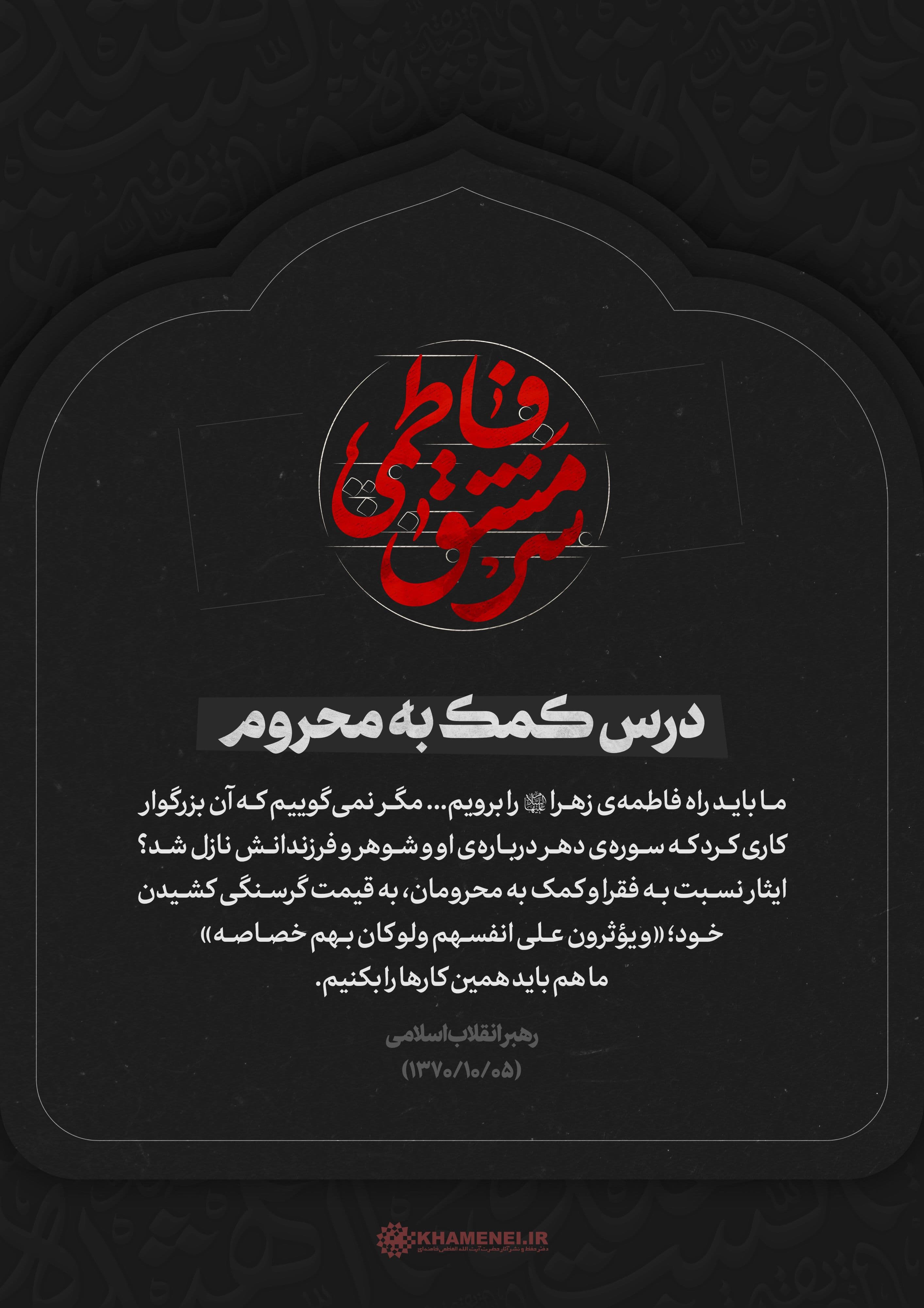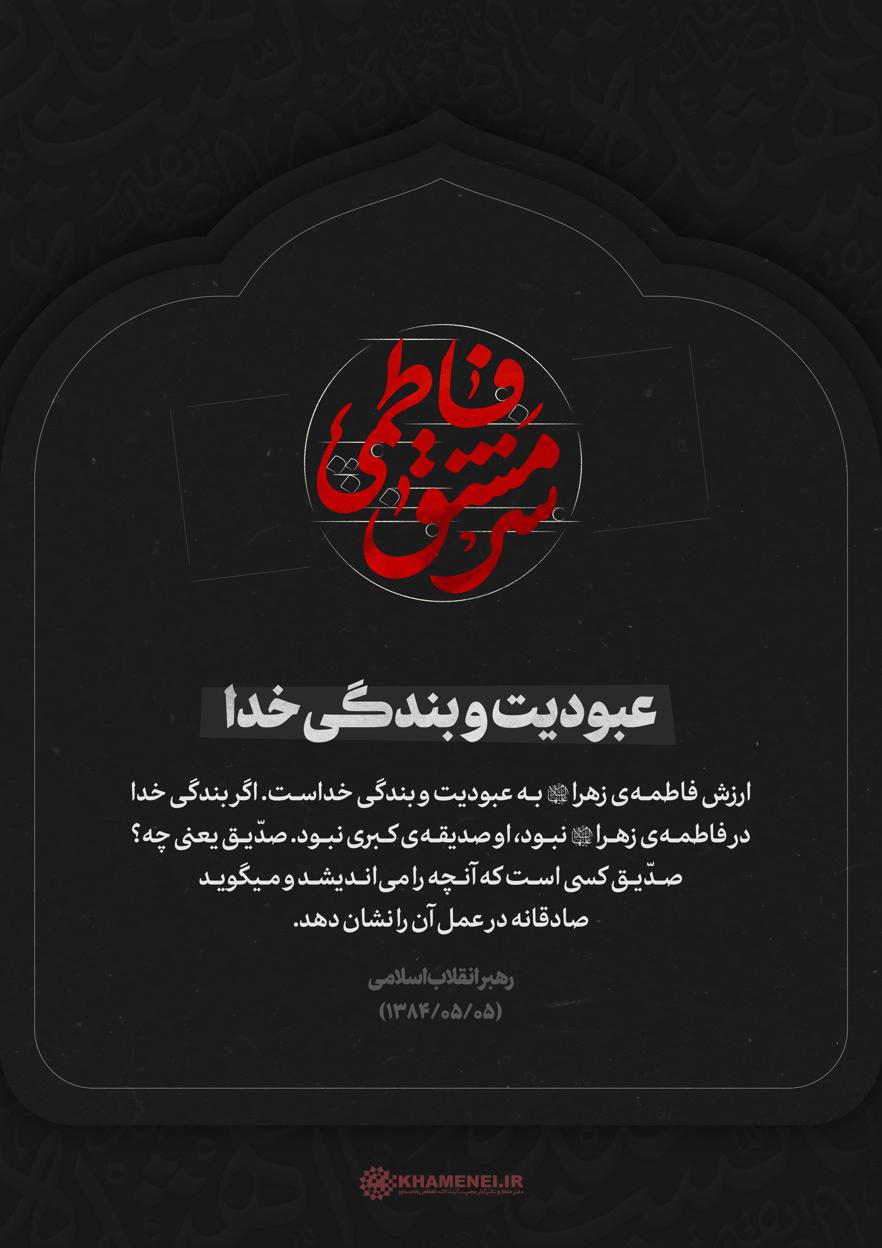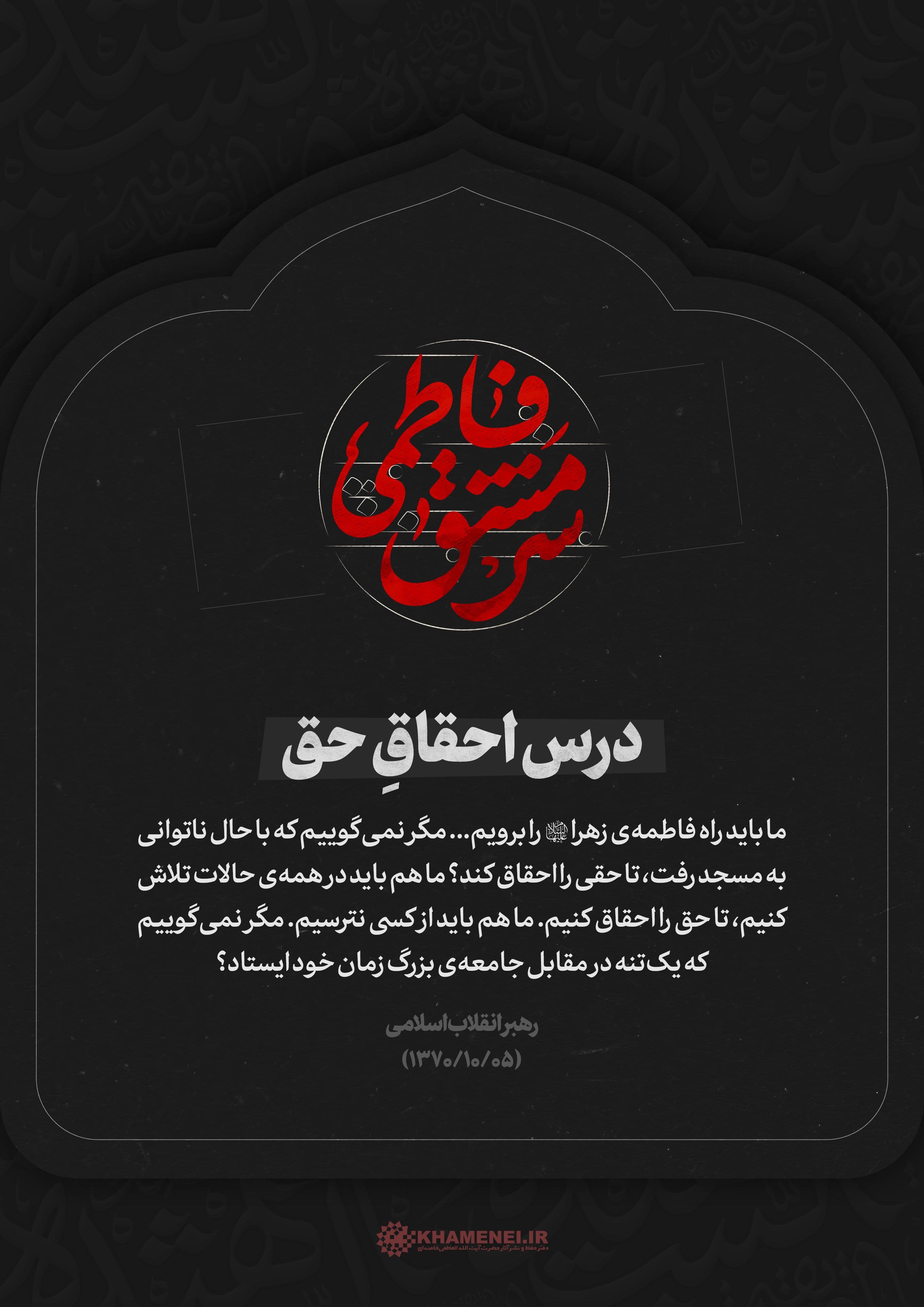 رهبر انقلاب: باید فاطمهی زهرا (سلام الله علیها) اسوه باشد، الگو باشد در همهی جهات، از جمله در حرکت بزرگ اجتماعی و انقلابی و مبارزاتی ما. ۱۴۰۰/۱۱/۳